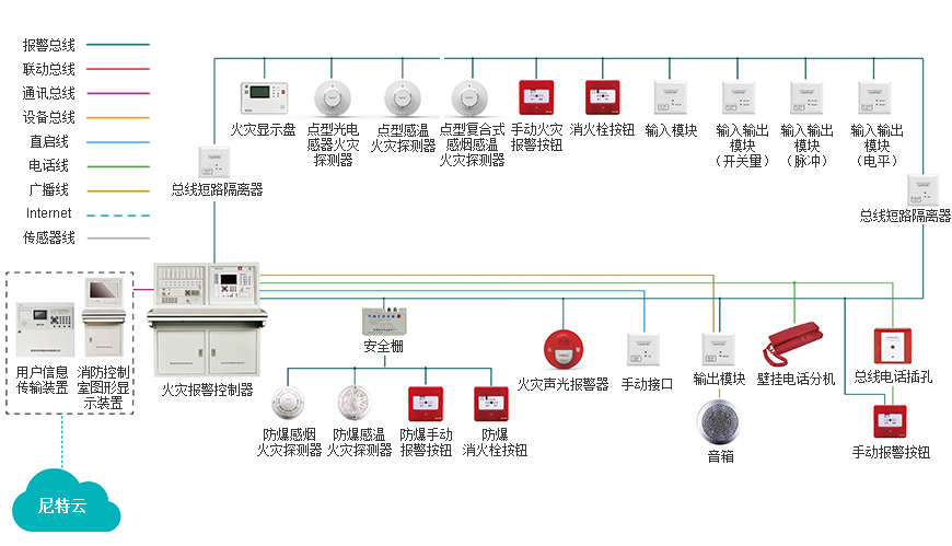 “二線制”解決方案完整,可提供包括火警探測(cè)、聲光警報(bào)、有源脈沖 / 電平的控制輸出在內(nèi)的各類 產(chǎn)品,超低運(yùn)行功耗處于業(yè)內(nèi)領(lǐng)先水平。系統(tǒng)以 NT8001 火災(zāi)報(bào)警控制器和 NT9011 消防控制室圖形顯示 裝置為核心,采用全數(shù)字量總線傳輸,通過(guò)“動(dòng)態(tài)采樣和斜率補(bǔ)償”技術(shù),增強(qiáng)系統(tǒng)遠(yuǎn)距離傳輸?shù)姆€(wěn)定 性。系統(tǒng)采用標(biāo)準(zhǔn) CAN 總線通信協(xié)議,可通過(guò)用戶信息傳輸裝置與“尼特云”智慧消防平臺(tái)相連。圖形顯 示裝置兼容標(biāo)準(zhǔn) RS232/RS485 通訊接口,可實(shí)現(xiàn)與消防一體化系統(tǒng)和“尼特云”智慧消防平臺(tái)的連接。 系統(tǒng)采用多種自測(cè)試、自診斷技術(shù),具有構(gòu)成完整、節(jié)約成本、運(yùn)行可靠的特點(diǎn)。
