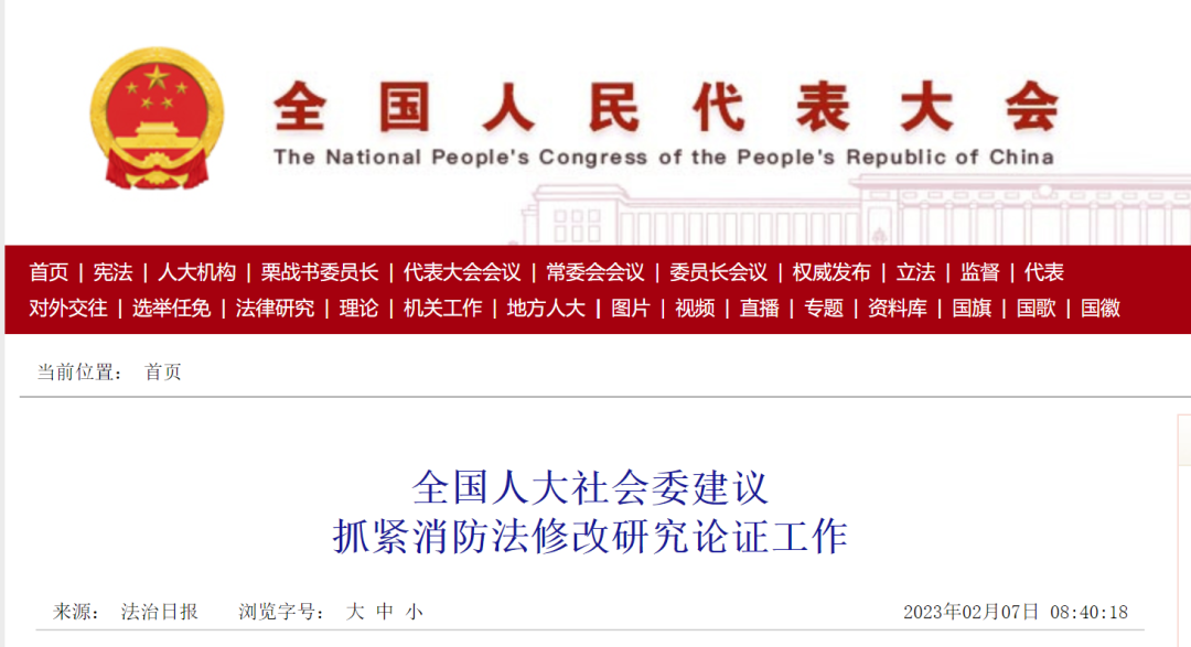 據(jù)了解,全國人大常委會(huì)于2021年開展了消防法執(zhí)法檢查,并于2022年進(jìn)行了跟蹤監(jiān)督。執(zhí)法檢查報(bào)告和常委會(huì)審議意見明確了法律實(shí)施存在的問題,并提出完善消防法律法規(guī)、適時(shí)修改消防法的建議。2022年十三屆全國人大五次會(huì)議期間,有代表提出關(guān)于修改消防法的議案。議案提出,消防法中火災(zāi)預(yù)防、滅火救援、監(jiān)督檢查、法律責(zé)任等內(nèi)容不夠完善,現(xiàn)階段消防事業(yè)仍滯后于人民群眾消防安全的需要。建議修改消防法,進(jìn)一步理順消防管理體制,夯實(shí)消防安全責(zé)任,增加新領(lǐng)域新業(yè)態(tài)消防安全內(nèi)容,加強(qiáng)數(shù)字化消防安全風(fēng)險(xiǎn)管控,健全法律責(zé)任追究體系。