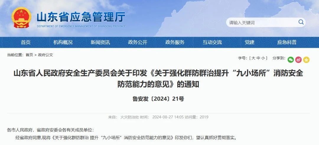 山東省人民政府安全生產(chǎn)委員會(huì)關(guān)于印發(fā)《關(guān)于強(qiáng)化群防群治提升“九小場(chǎng)所”消防安全防范能力的意見(jiàn)》的通知