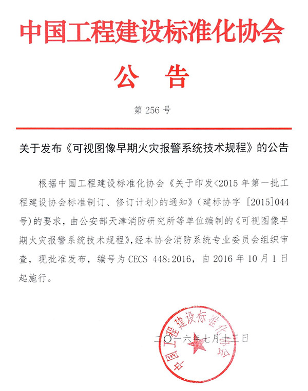 根據中國工程建設標準化協會《關于印發<2015年第一批工程建設協會標準制訂、修訂計劃>的通知》(建標協字[2015]044號)的要求,由天消所主編,國家消防工程技術研究中心、華東建筑設計研究總院,天津、上海、廣東、云南省公安消防總隊,北京市文物局、等單位共同參編的《可視圖像早期火災報警系統技術規程》現已由中國工程建設標準化協會發布,2016年10月1日起開始實施。