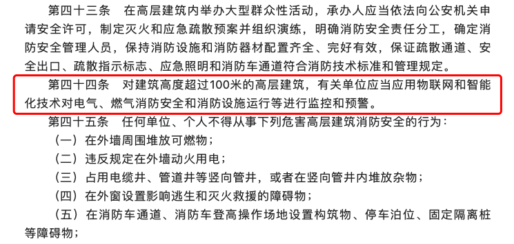 值得一提的是,在新《規(guī)定》第四十四條提出:“對(duì)建筑高度超過100米的高層建筑,有關(guān)單位應(yīng)當(dāng)應(yīng)用物聯(lián)網(wǎng)和智能化技術(shù)對(duì)電氣、燃?xì)庀腊踩拖涝O(shè)施運(yùn)行等進(jìn)行監(jiān)控和預(yù)警”。對(duì)高層建筑消防安全智能化管理進(jìn)行了細(xì)化與明確,以確保相關(guān)規(guī)范的有效落實(shí)。
