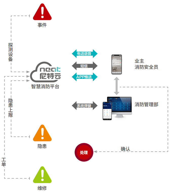 尼特家用獨立可燃氣體探測器和工業及商業用途點型可燃氣體探測器可以全天候探測場所內燃氣濃度,高精度探測并智能判斷是否真實漏氣,檢測到燃氣泄露立即發出報警信號,聯動關閉機械手/電磁閥,提醒現場人員及時發現、及時逃生,并以電話語音、短信、APP、網頁推送等方式通知給相關管理人員,實現火情的實時感知與預警,同時將所有數據上傳至尼特云智慧消防平臺“一張網”中,便于監管部門進行統一的可視化管理,以電子流程管理、分級管理和多負責人制度,對火災警情、隱患處置形成流程化閉環,落實安全主體責任和監管責任,實現各類場所消防標準化管理、精準化控制。