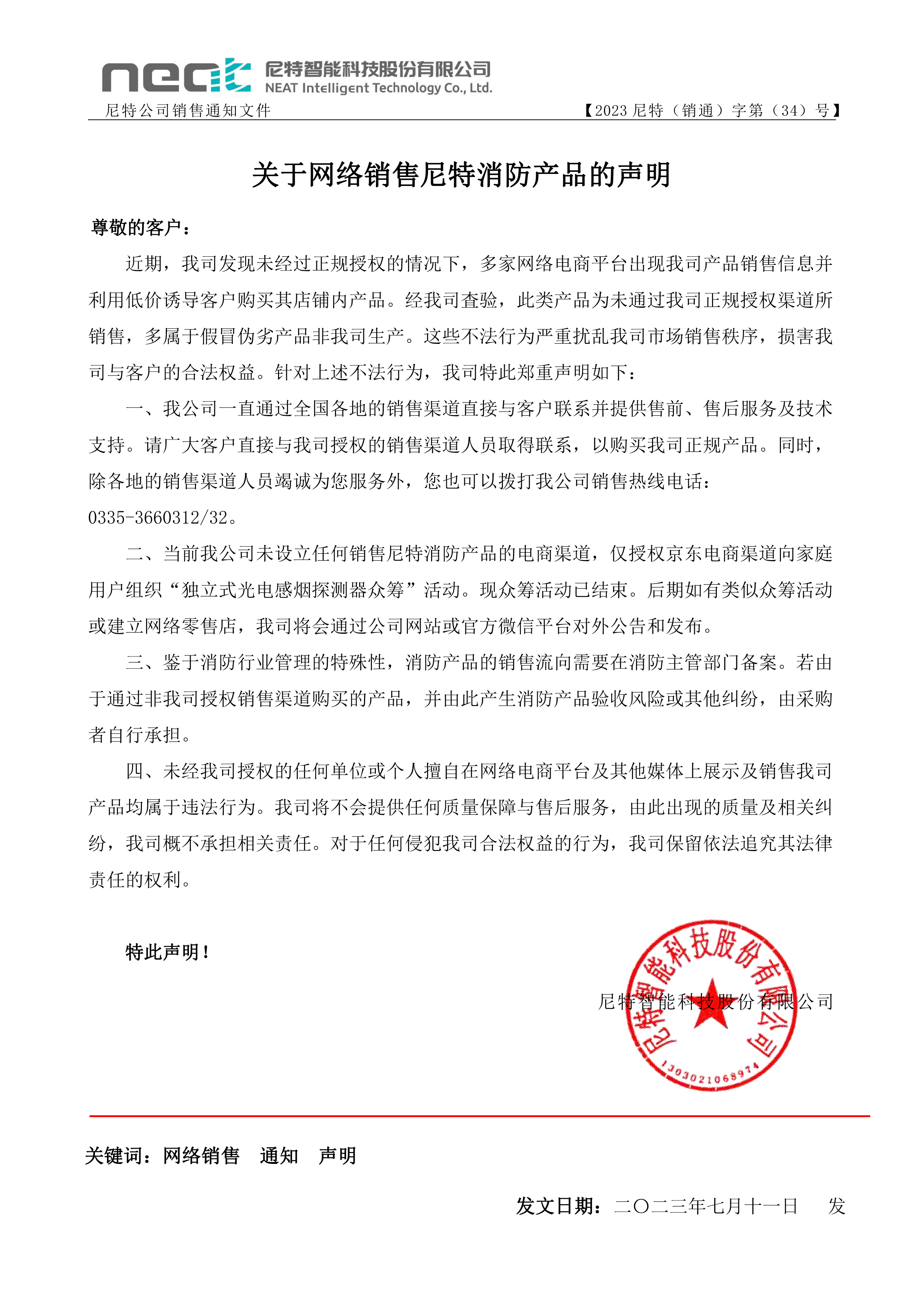 謹防假冒丨關(guān)于網(wǎng)絡(luò)銷售尼特消防產(chǎn)品的聲明