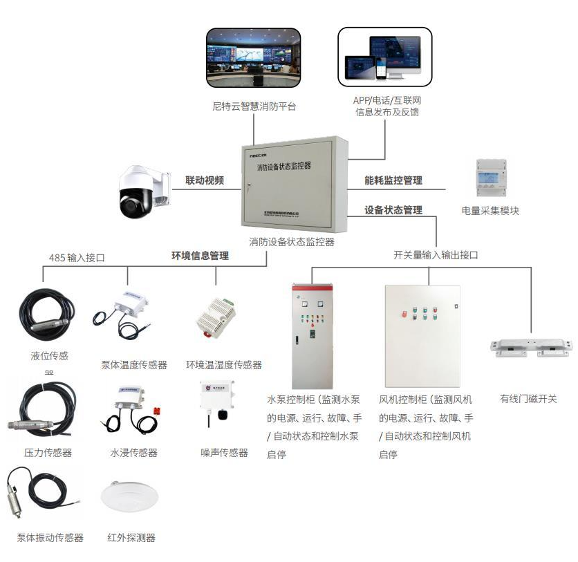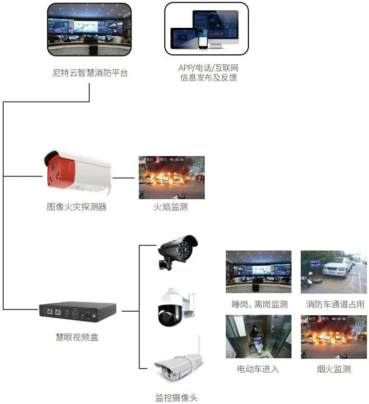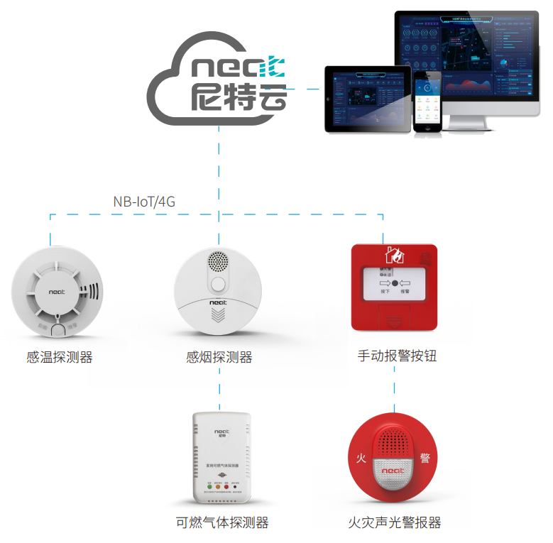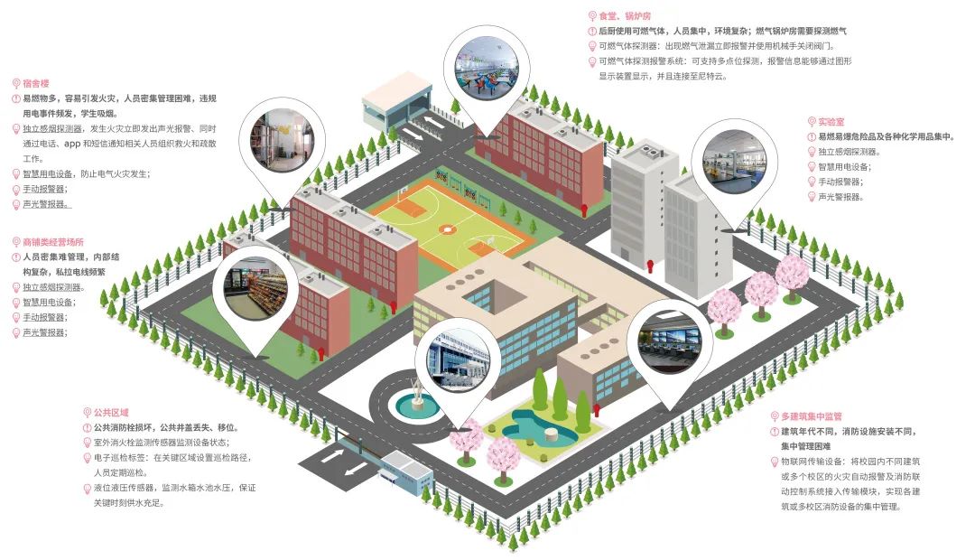 基于物聯網等前沿技術手段,尼特利用物聯網、云計算、人工智能等最新技術,精準定位各類校園的消防安全隱患,采用獨立聯網的智能探測設備,實時感知警情信息并上傳至尼特云智慧消防管理平臺,平臺將前端探測設備發現的預警信息,通過電話語音、短信、APP推送,及時將火警信息推送至校園安全值班人員、后勤部門、監管單位終端,可第一時間現場復核,實現火情等安全隱患的早預警、早發現、早撲救,達到少損失、少傷亡的目的。