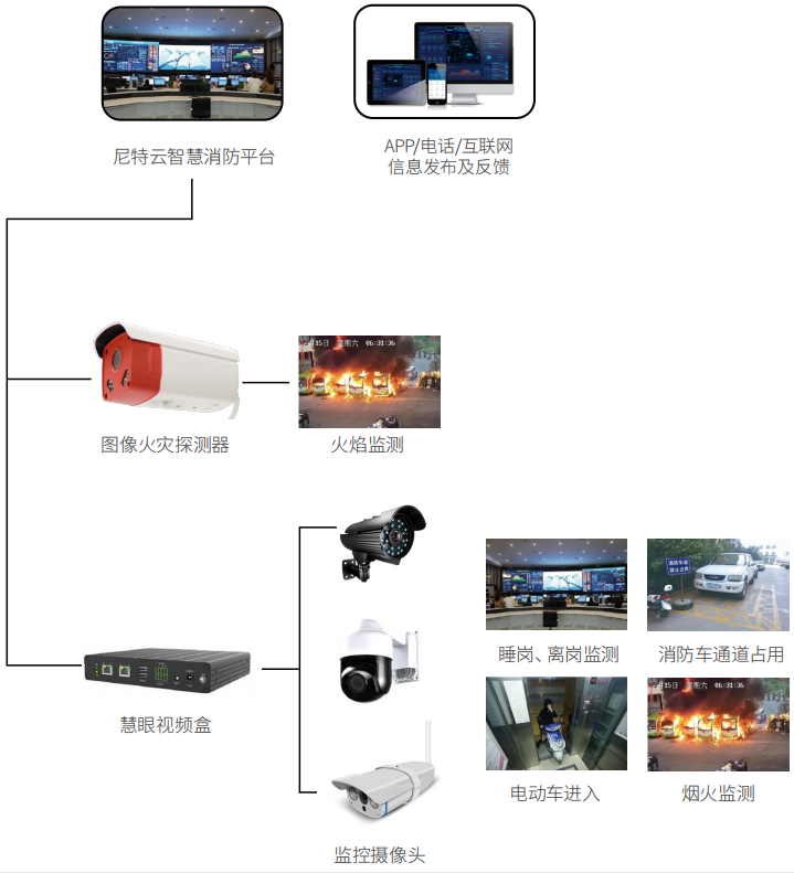 針對室內(nèi)消防逃生通道、室外消防車道廣泛存在的堵塞和占有的情況,尼特結(jié)合視頻AI技術(shù),對于國網(wǎng)供電需要加強火災(zāi)防控的重要部位,以慧眼視頻盒智能監(jiān)管建筑內(nèi)新增或原有的視頻監(jiān)控,發(fā)生火災(zāi)時聯(lián)動展現(xiàn)報警點視頻,實現(xiàn)火點檢測、煙霧識別、逃生通道物品堵塞、消防通道車輛占用、電動車違規(guī)充電或停放、消控室人員在離崗、消控室人員持證上崗等智能監(jiān)測應(yīng)用,實現(xiàn)國網(wǎng)供電的消防一體化管理。