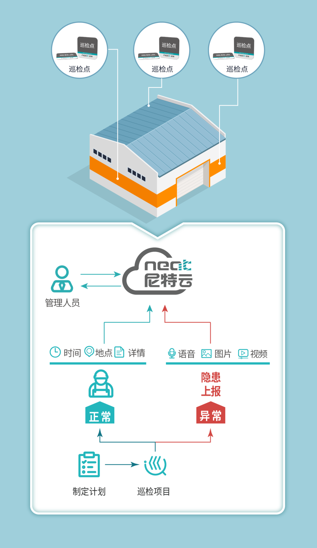 通過NFC技術,在倉庫消防重點部位布設電子巡查碼,巡檢人員通過“一物一碼”快速定位設備,實現設備管理的智能化、快捷化,告別低效巡檢,云平臺數據實時同步,責任劃分清晰且便于管理。