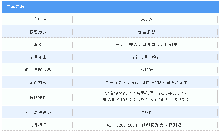 根據不同的場合,不同額定動作溫度的探測需求,產品分為JTW-LD-NT8119/85纜式線型感溫火災探測器與JTW-LD-NT8119/105纜式線型感溫火災探測器兩種,探測溫度分別為85℃、105℃兩個級別,最大長度400m,標準報警長度1m,適用于大宗場所需求。