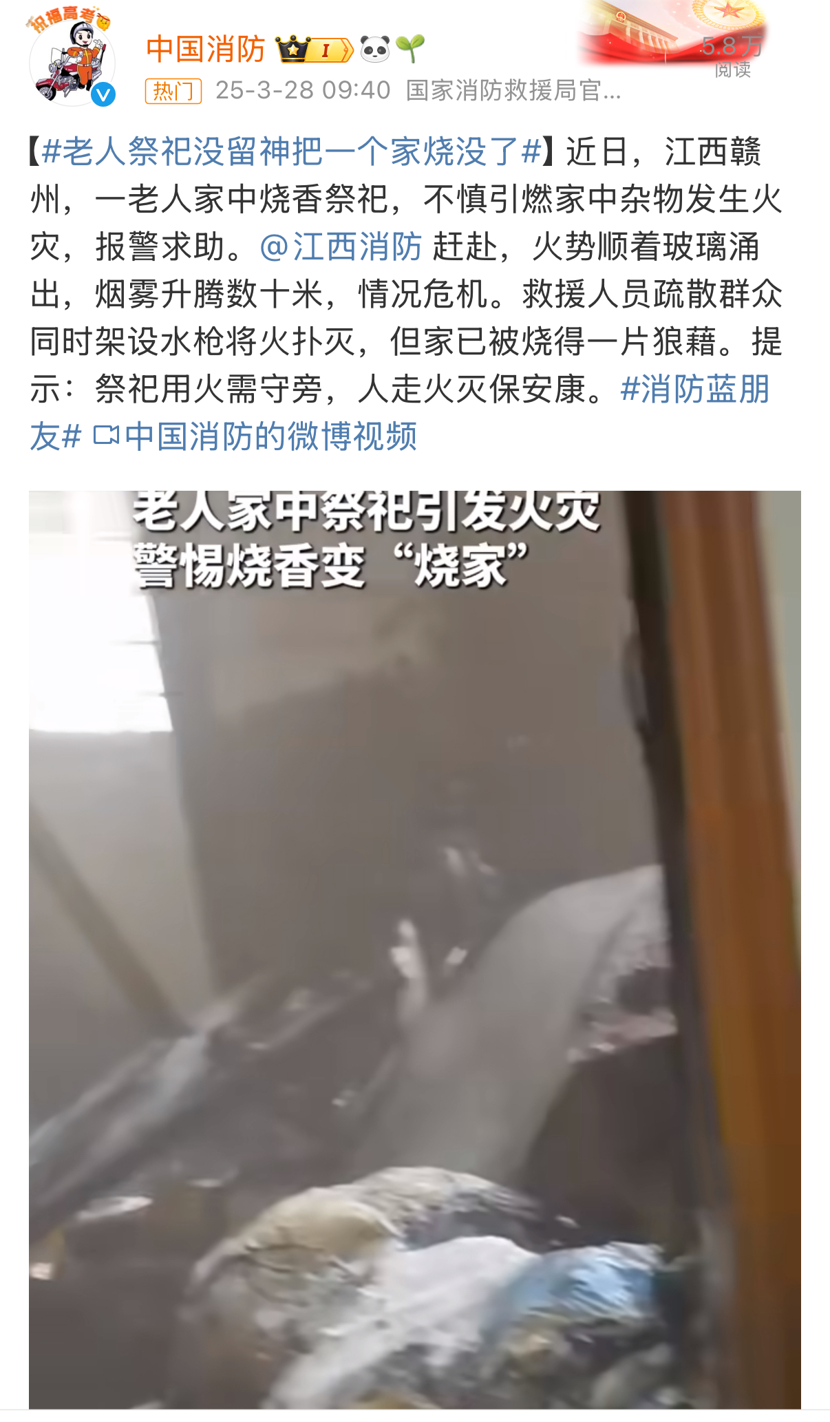 每年因家中祭祀燒紙而引發(fā)火災(zāi)的新聞屢見不鮮,不僅給家庭帶來了沉重的打擊,也造成了不可挽回的損失。近日,江西贛州一老人家中燒香祭祀不慎引燃家中雜物發(fā)生火災(zāi),好在救援及時(shí)未造成人員傷亡,但老人家中已被燒得一片狼藉。這樣的安全事故并非個(gè)例,全國各地每年都報(bào)告多起類似事件,這提醒我們?cè)谶M(jìn)行祭祀活動(dòng)時(shí)需格外注意消防安全。