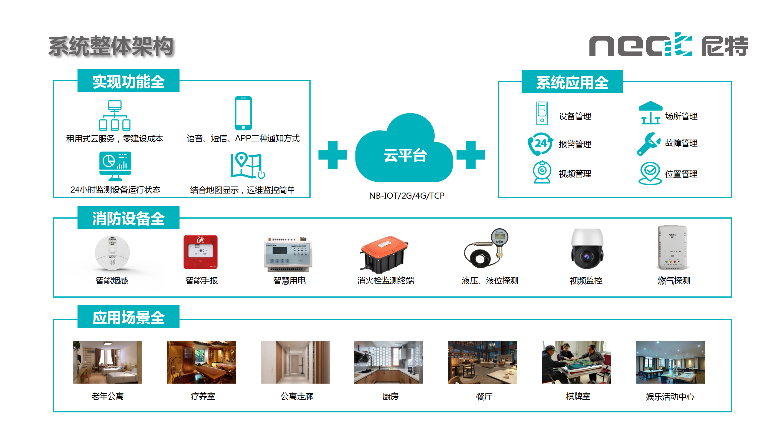 根據養老機構實際需求,尼特智能集成無線火災報警監測、可燃氣體探測報警、電氣火災隱患監測、消防用水監測、AI視頻監控等功能,結合尼特云智慧消防管理平臺,為養老機構的公寓、廚房食堂、老年娛樂活動中心等重點區域打造了從現場數據采集到云端處理,再到APP和Web端實時監控與預警的智慧消防解決方案。