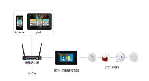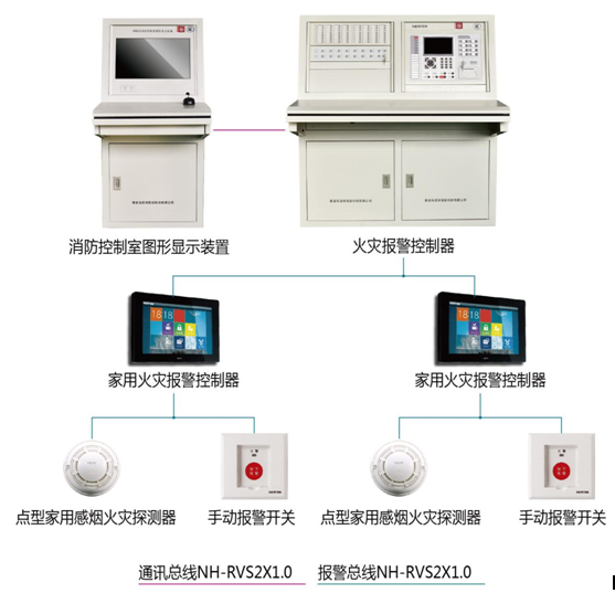 系統由火災報警控制器、圖形顯示裝置、家用火災報警控制器、點型家用感煙火災探測器和手動報警開關組成。