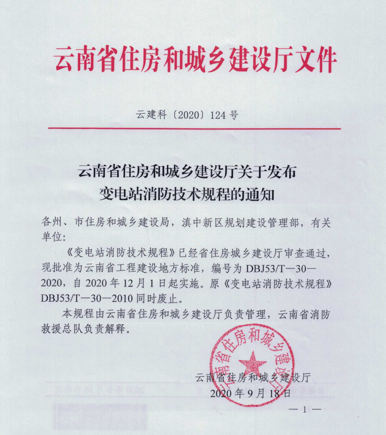 2020年9月18日,云南省住房和城鄉建設廳正式發布通知,《變電站消防技術規程》已經省住房城鄉建設廳審查通過,批準為云南省工程建設地方標準,編號為DBJ53/T-30-2020,自2020年12月1日起實施。尼特作為國內最早從事消防電氣系統事業的企業之一,憑借行業影響力和豐碩的研發成果、豐富的項目經驗,積極參與了此次云南地標的編制工作。