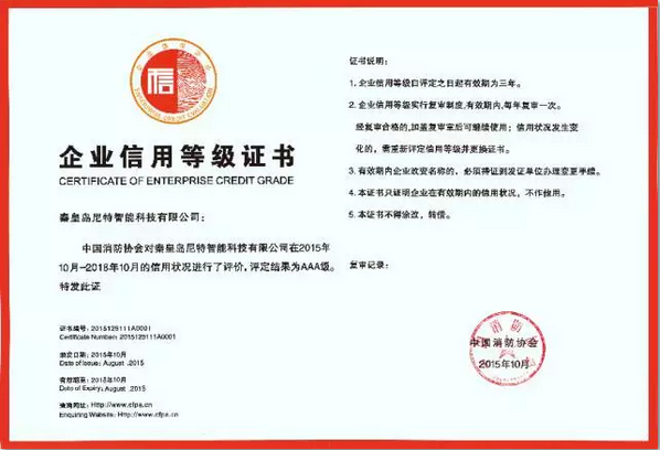 2015年11月,中國消防協會信用評價等級評選結果出爐,秦皇島尼特智能科技有限公司被評為2015年度中國消防協會“中國消防行業信用等級評價AAA級企業”稱號。這是中國消防行業...