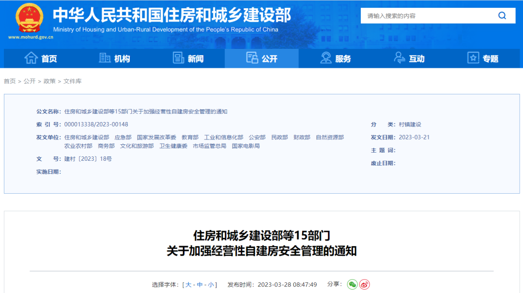 經國務院同意,近日住房和城鄉建設部、應急部等15部門聯合印發了《關于加強經營性自建房安全管理的通知》(以下簡稱《通知》),要求以習近平新時代中國特色社會主義思想...