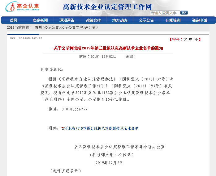 根據(jù)《高新技術(shù)企業(yè)認(rèn)定管理辦法》(國科發(fā)火〔2016〕32號(hào))和《高新技術(shù)企業(yè)認(rèn)定管理工作指引》(國科發(fā)火〔2016〕195號(hào))有關(guān)規(guī)定,經(jīng)過全國高新技術(shù)企業(yè)認(rèn)定管理小組對(duì)河...